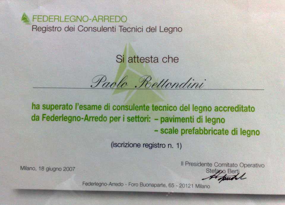 Iscritto al registro dei Consulenti Tecnici del Legno – Federlegno-Arredo al n° 1 – Settori Merceologici: pavimenti in legno – scale prefabbricate in legno