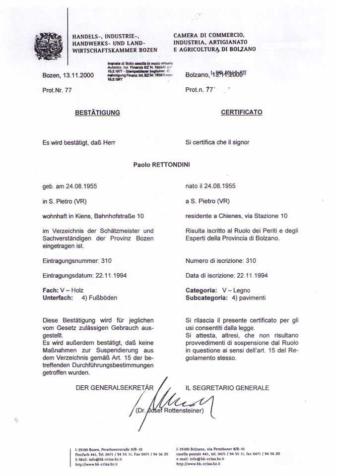 Iscritto al ruolo dei Periti e degli Esperti della C.C.I.A.A. (BZ) al n° 310 cat. V° sub. 4 (pavimento in legno)