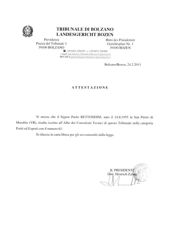 Consulente Perito Estimatore – (C.T.U.) al n° 61 Tribunale di Bolzano