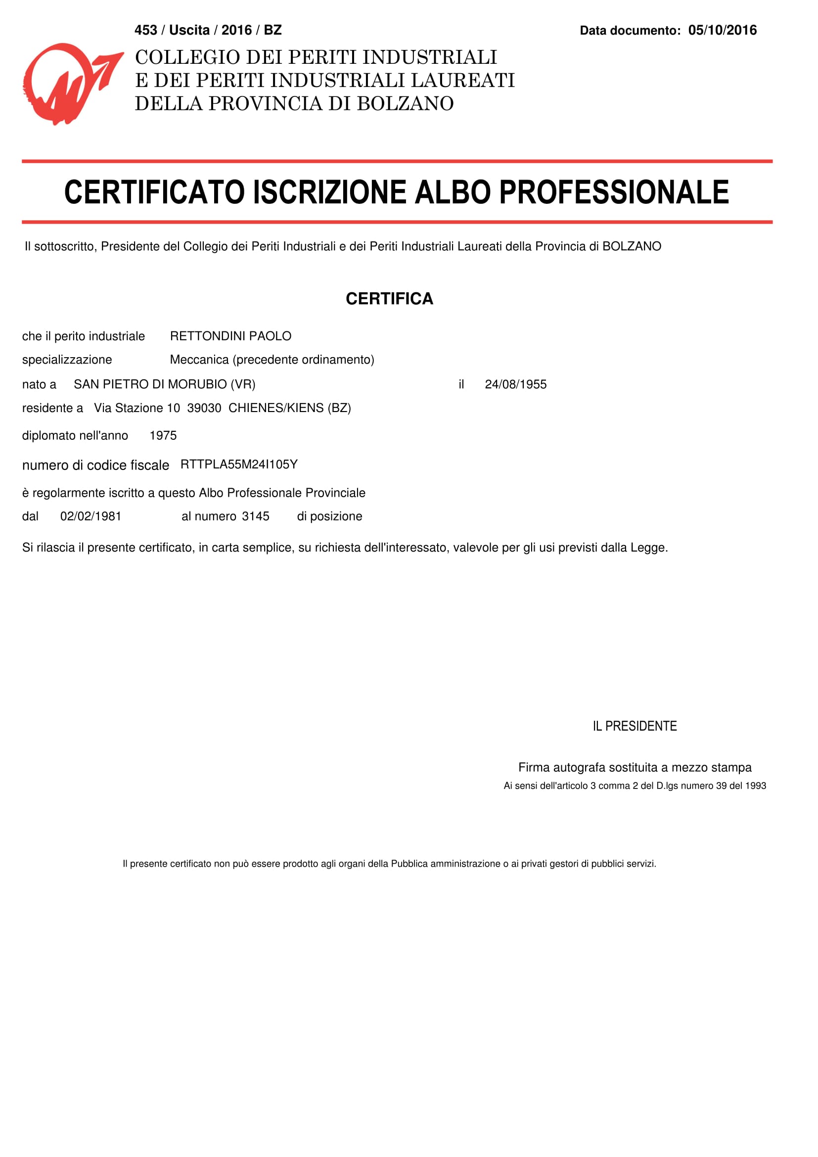 Certificato iscrizione albo periti industriali Bolzano al n° 3145